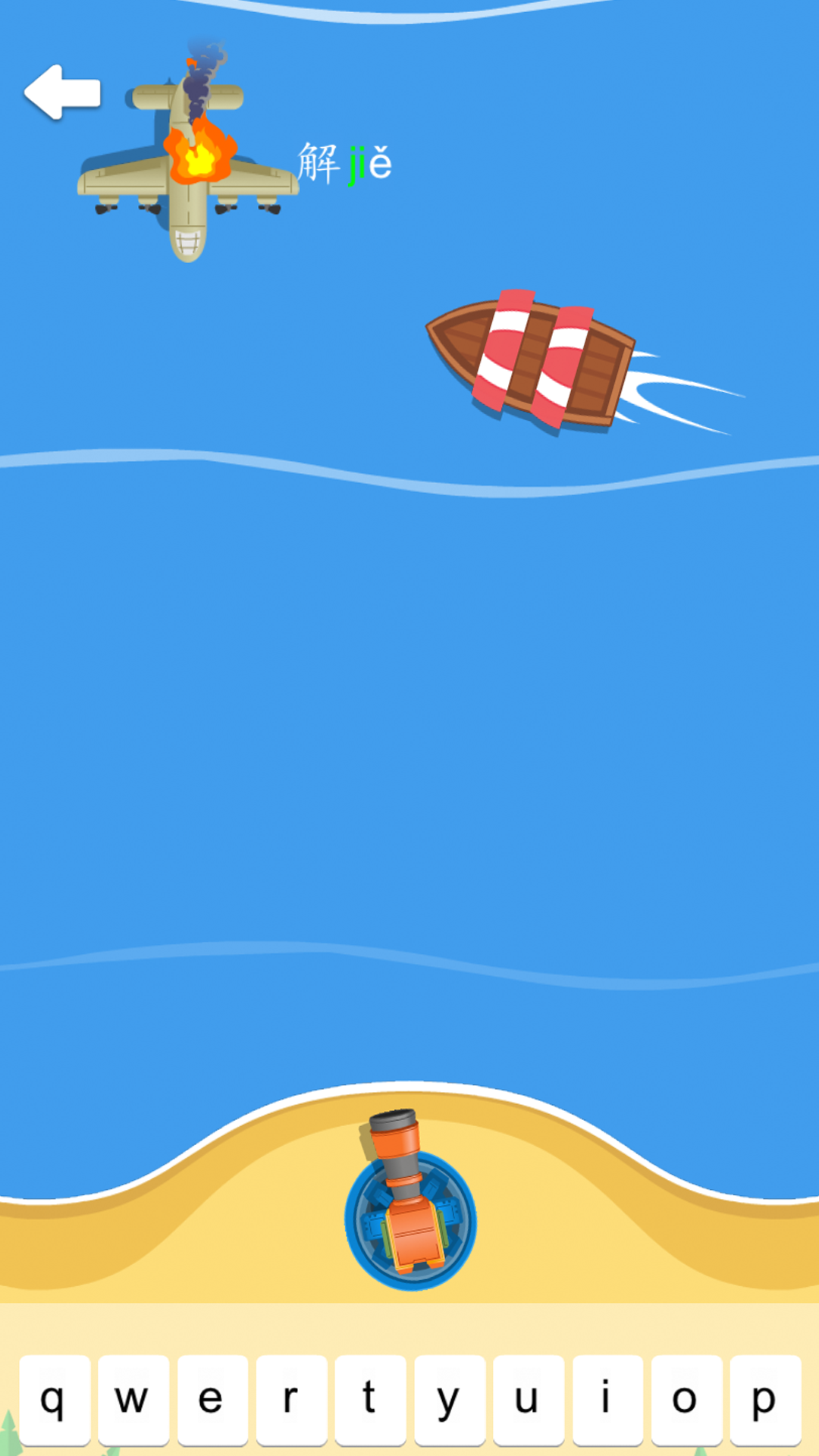 2. 互动参与:"游戏"的目标是键入在飞机旁字符的拼音。如果键入的拼音与字符匹配,飞机会'爆炸',象征着成功学习了该字符及其拼音。