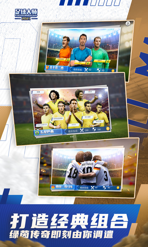 《足球大师黄金一代》是一款沉浸式足球经理手游,提供欧洲杯、美洲杯等全新玩法,同步真实赛事激情。游戏采用全3D比赛画面,高度还原球场氛围与竞技体验。玩家可招募梅西、C罗、齐达内等新老传奇球星,自由组建梦幻阵容,并通过发掘培养球员、参与全球联赛挑战,逐步打造属于自己的世界级球队。游戏深度模拟俱乐部经营历程,致力于成为足球经理类游戏的标杆之作。