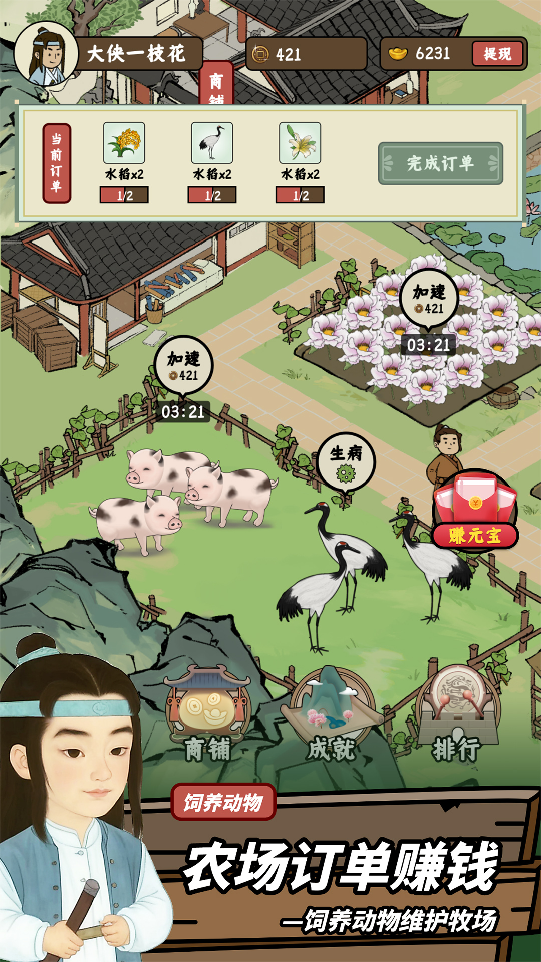 《猪猪红包世界》是一款以农院风格为主题的休闲类手机应用。用户通过简单操作即可在虚拟农院中种植作物、制作美食并升级设施,在体验悠闲田园生活的同时,还有机会收获红包奖励。