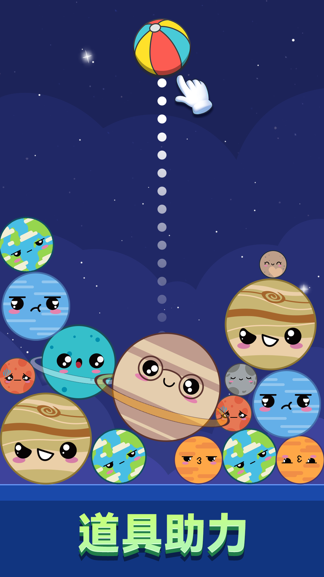 这是一款以星球为主题的合成游戏,玩家从最小的月亮开始,通过合成逐渐升级为地球、火星等更大的星球,最终目标是合成大太阳。游戏画面精美,每个星球都有独特的颜色和表情,配合Q弹的音效,带来轻松有趣的体验。操作简单,适合所有年龄段的玩家,没有任何限制,可以尽情享受合成乐趣。
