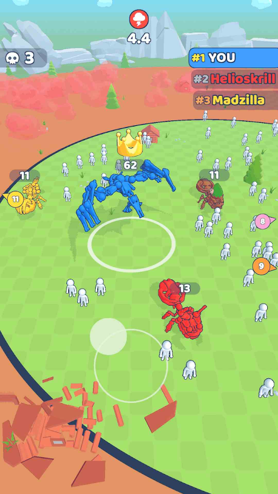 一款益智休闲竞技类游戏,通过各种方法把自己变化成一个巨大的变形动物,收集路上行走散落的小人,不断变大,变得足够大时才能吞噬掉竞技场中的其他的变形动物