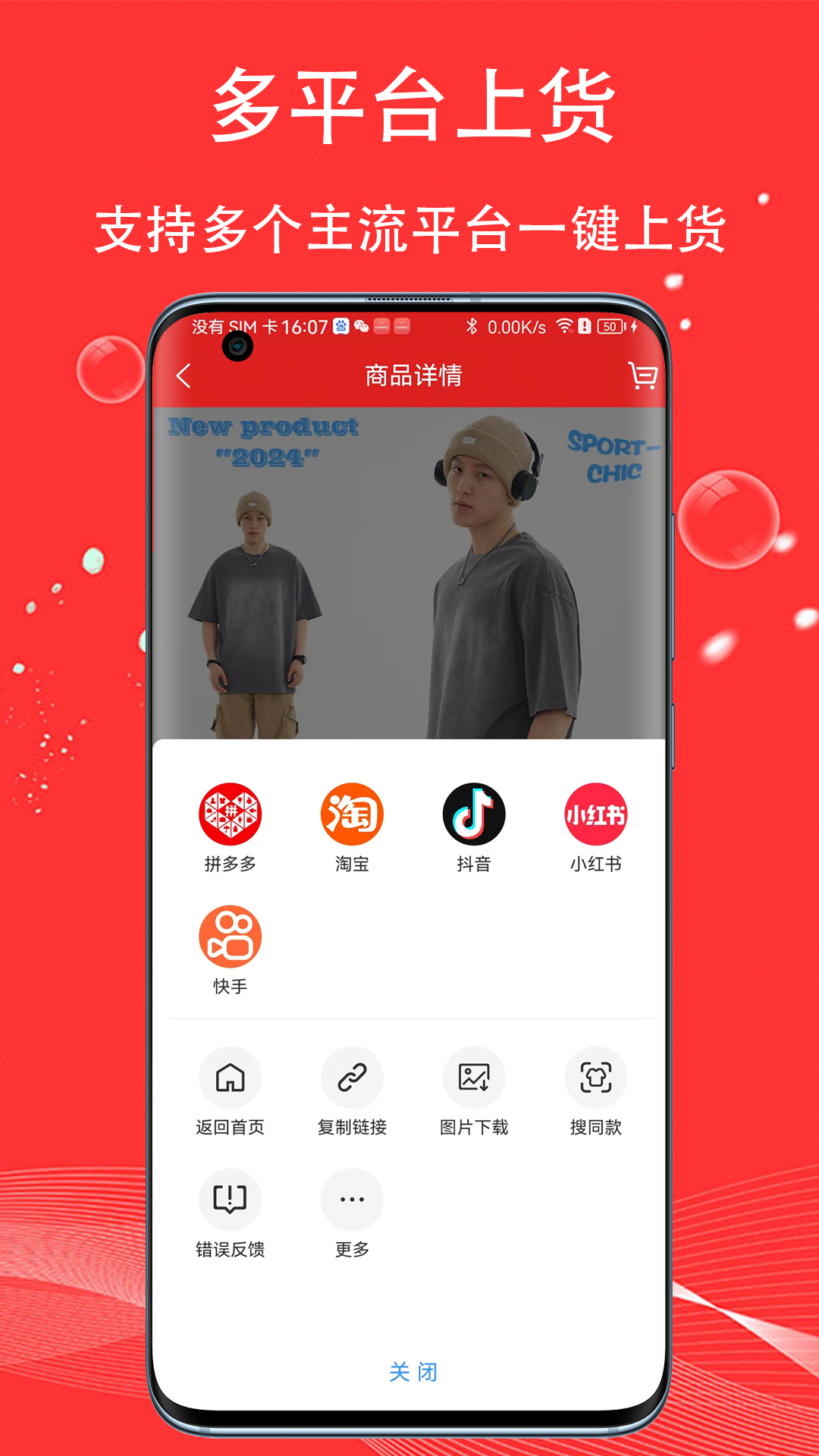 平台支持多平台一键上货,包含淘宝、天猫、京东、拼多多、抖音等大众平台上货,实现足不出户即可轻松赚钱。