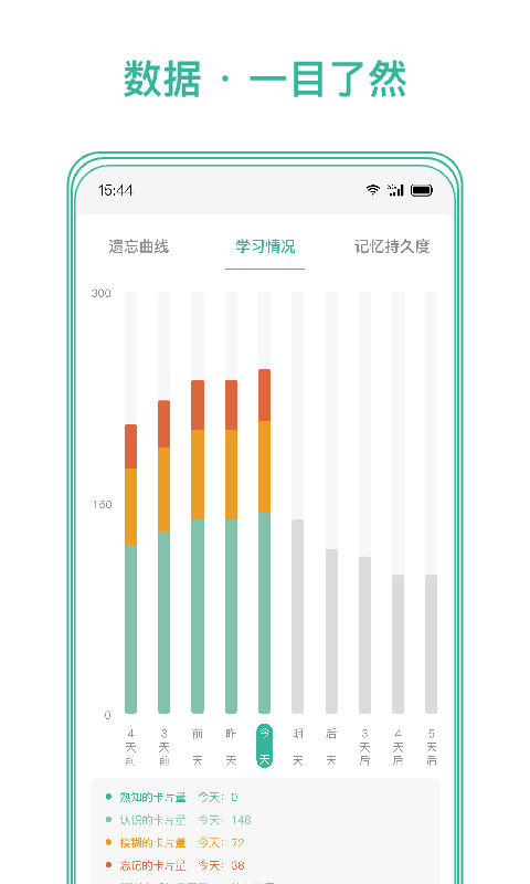 - 可以查看自己的记忆数据:遗忘曲线、记忆持久度、每日学习情况。
