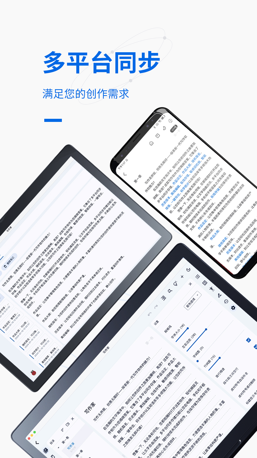 想象一下,无论身处何地,您都能随时打开这款软件,轻松捕捉灵感,让文字自由流淌。多平台同步存储功能让您在电脑、手机和平板设备之间无缝切换,随时继续未完成的创作。