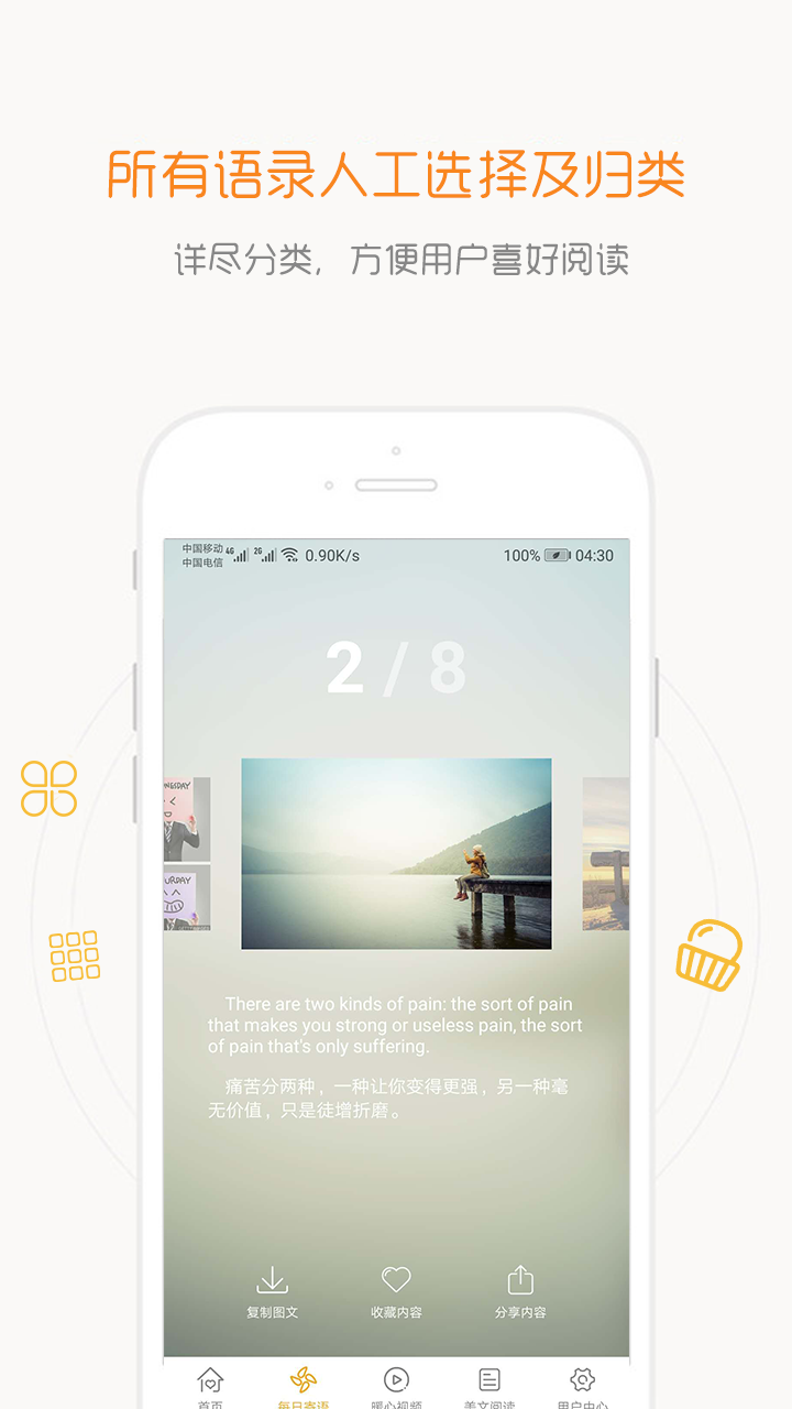 这款一句话心情语录APP以简约界面展现发人深省和感动的语录,提供知识和心灵提升,帮助用户净化情绪、传递积极能量。最新版本优化了体验,专注于提供更简洁、更具影响力的内容。