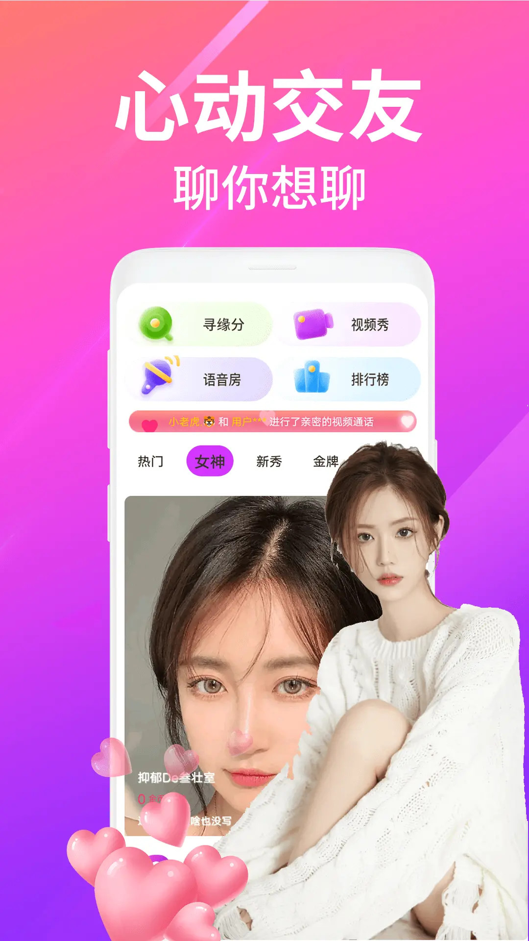 夜沁聊天交友是一款集恋爱,社交,找对象、约会的社交app,真实的陌生人在线约伴聚会聊天的社交软件。同城单身的你巧遇附近的她,在她柔声魅语中,拉近彼此的心灵。爱生活,爱聊天,视频聊天、匿名聊天、视频交友、组cp、处对象!。这是一个全新的聊天交友APP,实时社交新玩法同时还能看小姐姐直播视频聊天,同城附近的陌生单身男女,附近约会,告别孤独!