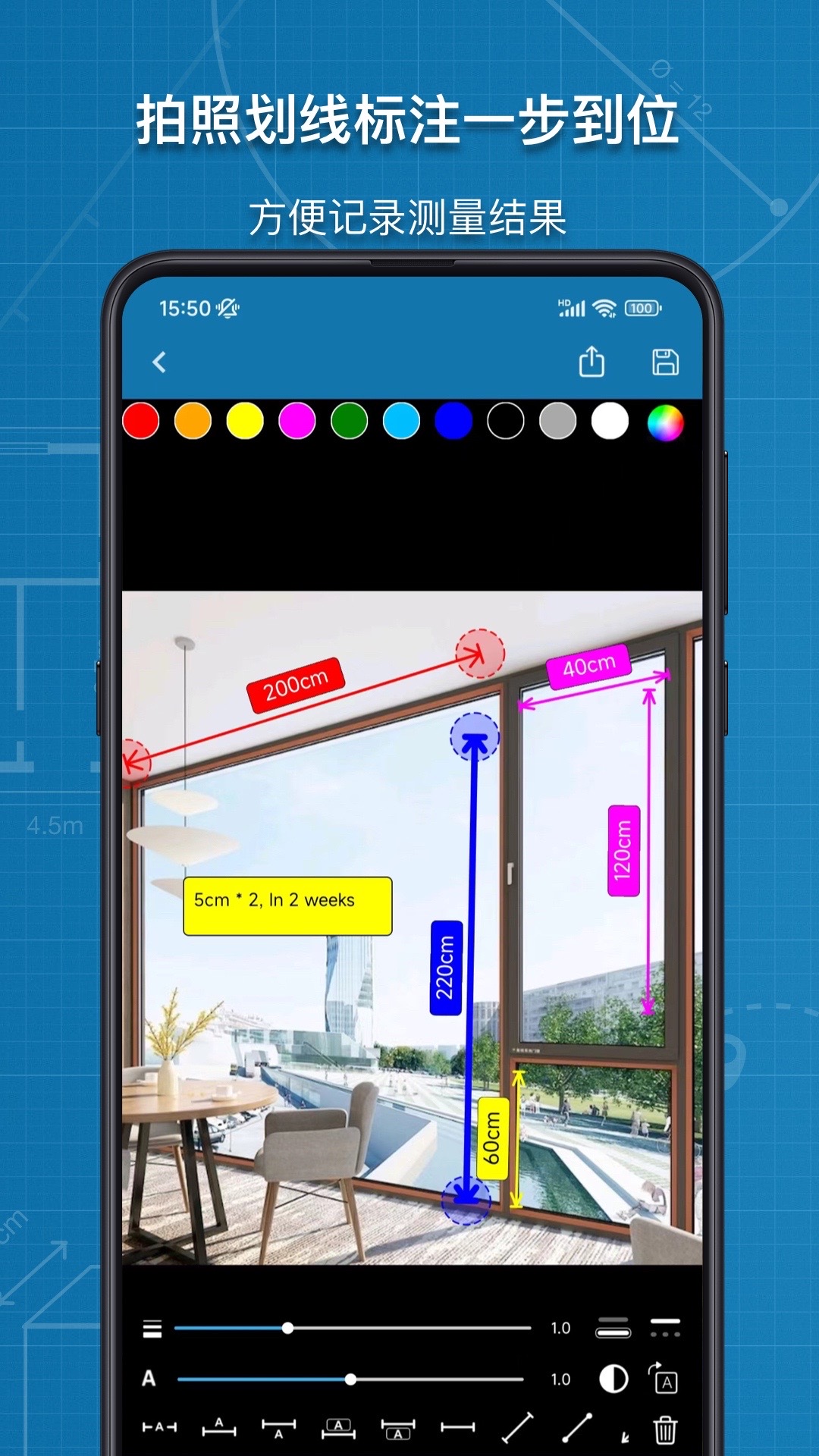 图片标记助手PhotosMeasure是一款简洁方便的图片标注工具,能够让您方便迅速的在图片上标记出物体的大小等信息,大大缩短您在装修量尺过程中纪录时间和繁琐度,提高您的工作效率。