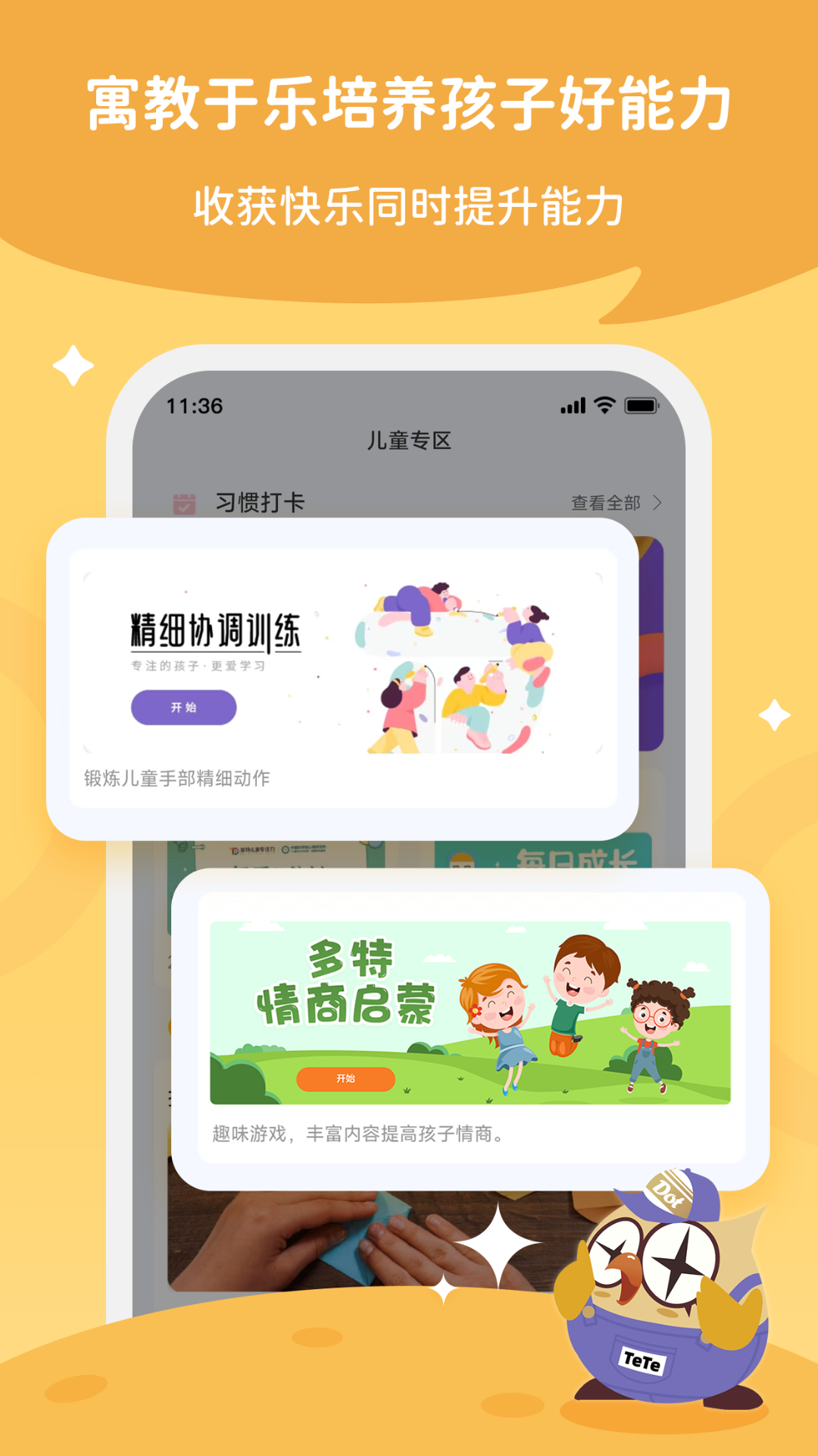 该APP专为多特儿童专注力会员设计,展示个性化训练计划并提供请假功能。通过直观的图表和报告,家长可以实时了解孩子训练时长、参训率、打卡频率以及训练成果评估、能力趋势等情况。此外,APP还提供丰富的育儿资源,包括育儿宝典、成长指南、家长学堂等,帮助家长培养孩子认知能力和社会适应能力。手指操指导和优质书籍推荐则为孩子提供了更多学习和娱乐的可能性。