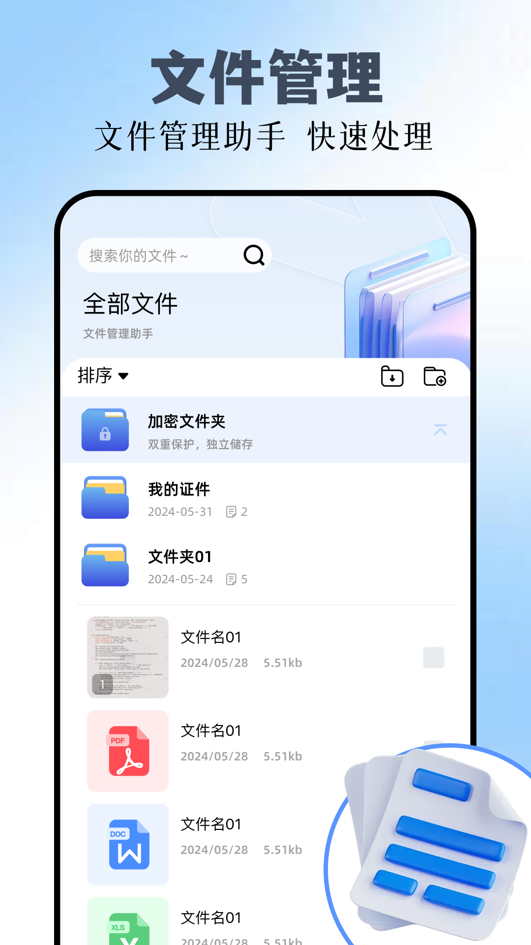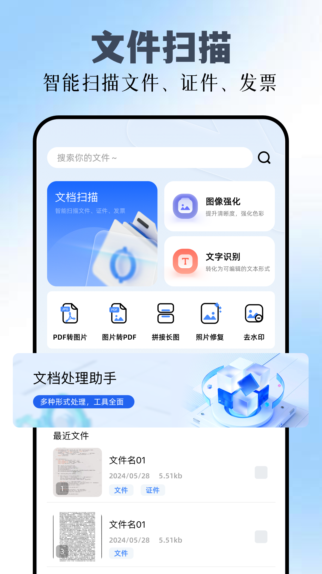 1. 文档扫描:它能够将纸质文档、名片、证件、合同等通过手机摄像头快速转换成清晰的电子版PDF或图片格式,便于数字化存储和管理。 2.文件管理:提供便捷的文件夹管理功能,用户可以按照自己的需求分类存储扫描文件,告别传统繁琐的查找过程。 3.PDF转换与导出:支持将扫描文件直接转换成PDF格式,同时也可将PDF文件转换成其他格式,如Word、Excel等,满足不同场景下的使用需求。