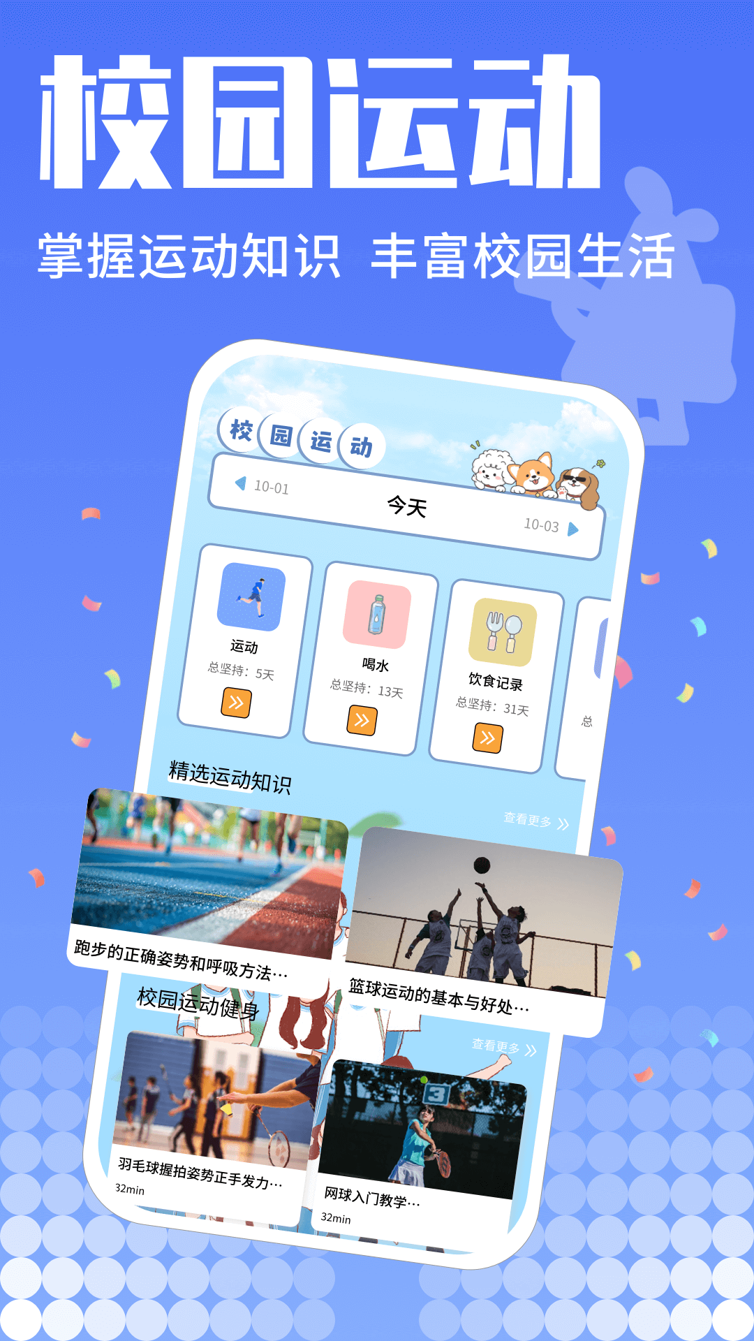 运动数据统计,健康喝水目标设置、饮食记录、拒绝外卖健康饮食。还推出了一些健康运动知识,为莘莘学子随时随地只要你想运动就能实现校园生活有趣化。