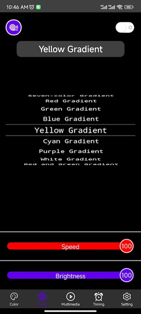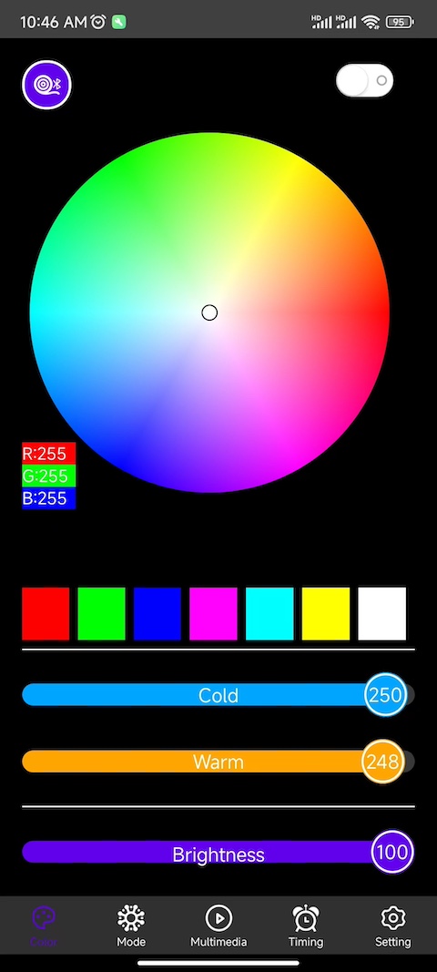 该应用用于控制智能蓝牙灯具设备,用于控制智能蓝牙灯具的颜色,亮度,开关,模式,另外还有麦克风控制模式和手机音乐控制模式。