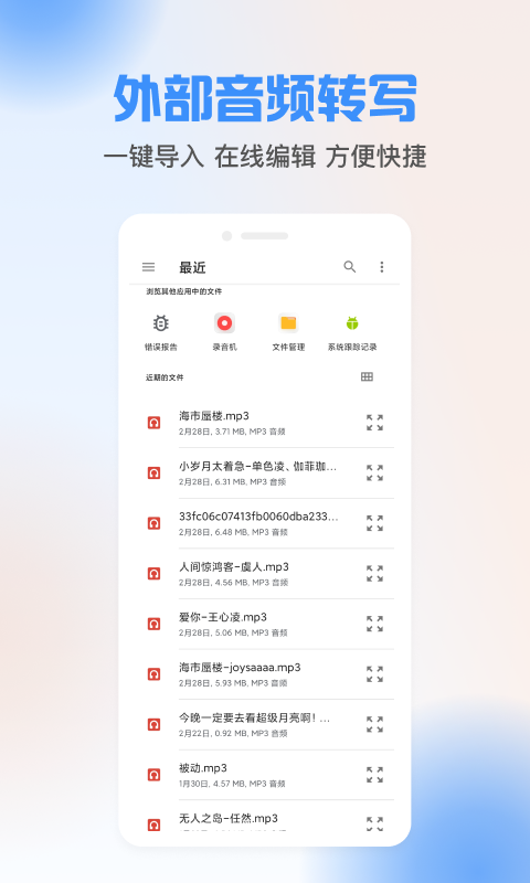 这款声音转文字应用是一款集录音转文字、语音转文字和图片转文字于一体的实用工具。它能够快速准确地将音频、视频以及图片转换为文字,提升办公和学习效率。此外,该应用还内置高清录音机功能,支持音频格式转换和剪辑合并,满足用户多方面的需求。无论你是商务人士需要记录会议纪要,还是学生想要整理课堂笔记,这款应用都能为你提供方便快捷的解决方案。