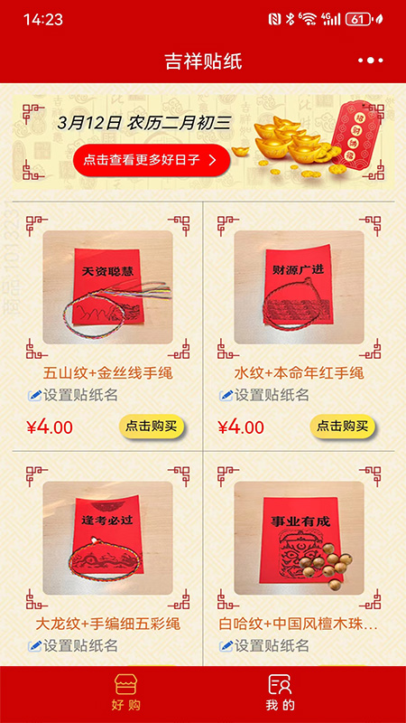 吉祥贴纸是一款手机应用,旨在传承和推广中国传统文化。用户可以在这里定制和购买各种中国传统元素的贴纸、剪纸、工艺品和饰品。这款APP由重庆伽兰达信息技术有限公司开发,通过网络平台为用户提供个性化定制服务,将精美的传统艺术融入现代生活。