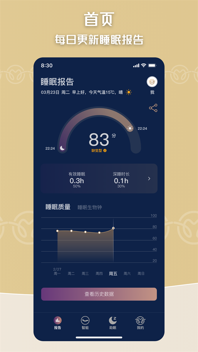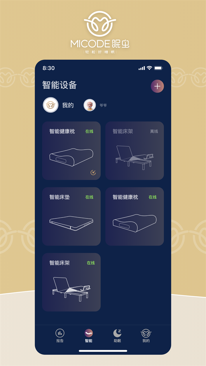 查看睡眠报告(需搭配眠虫发售的智能设备使用);