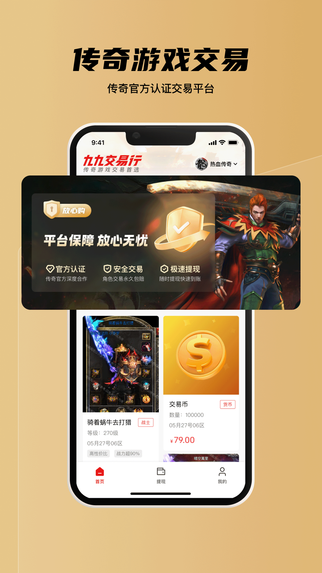 九九交易行是一款专为传奇游戏玩家打造的游戏交易平台。作为拥有官方认证的平台,它提供安全、便捷、稳定的交易服务,涵盖海量传奇游戏版本,是传奇玩家进行游戏交易的首选平台。