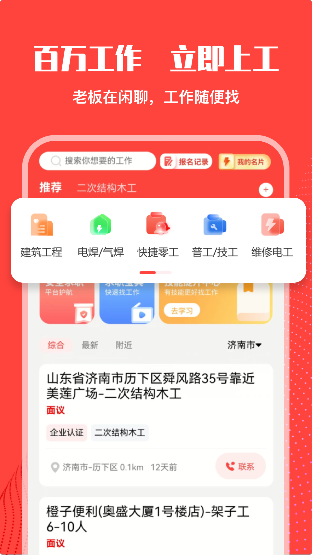 工人好找活:精准搜索附近高薪职位,实时在线沟通,快速响应,当天即可上岗,让找工作变得简单高效!