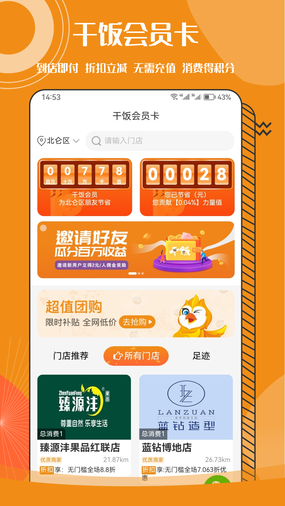 干饭VIP会员卡是一款集餐饮、休闲娱乐、果蔬生鲜、培训等多种消费场景于一体的通用会员卡应用。用户只需持卡在合作商家消费并买单,即可享受专属会员折扣价,轻松实现省钱目标。