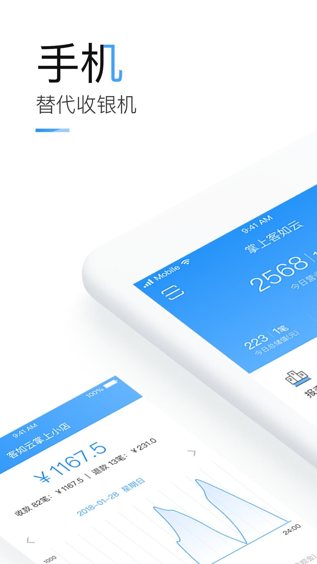 小店收银账目混乱,核对账目费力都可以通过掌上客如云解决,微信、支付宝、现金都可收款。