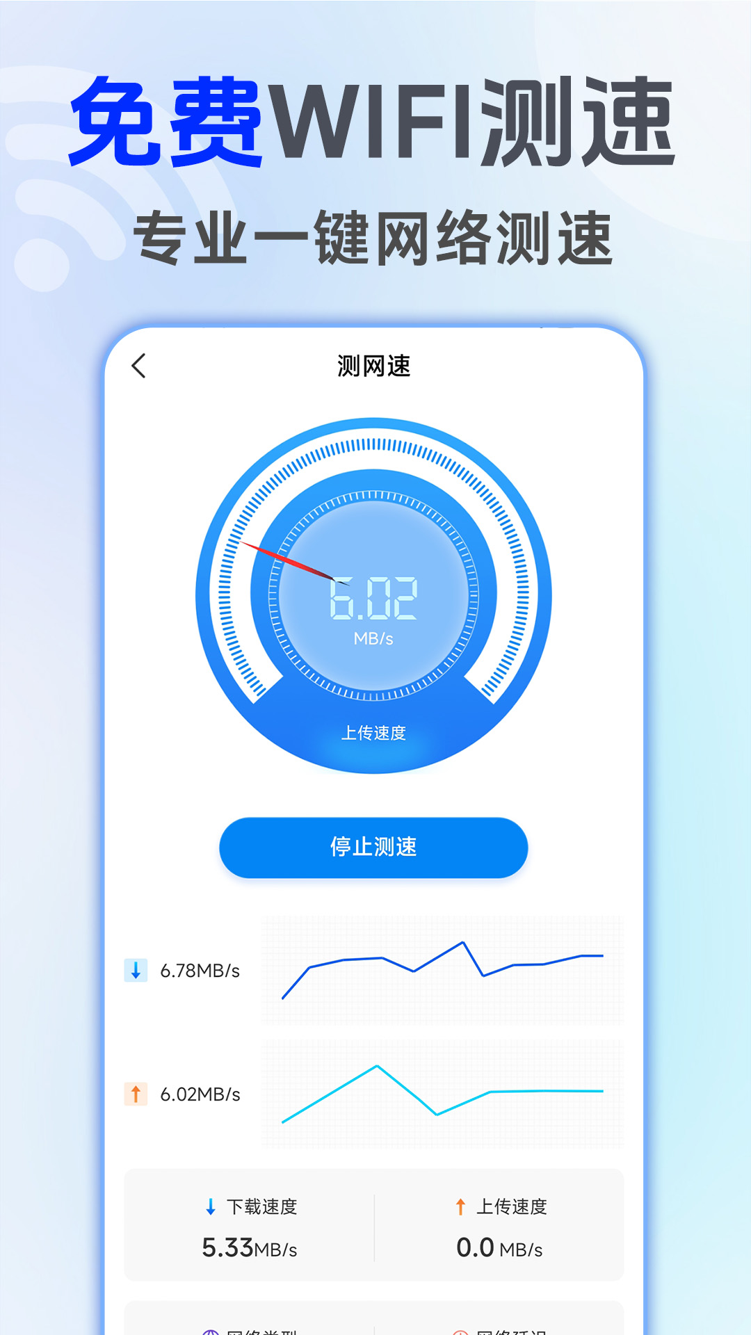 1、一键测速:查看手机网速,2G、3G、4G、5G、Wifi都可使用;