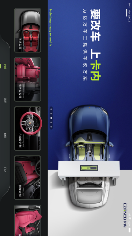 卡内车改HD是一款为汽车改装门店打造的APP,通过在线定制功能,为客户快速生成定制效果图和VR全景图,提升用户体验,降低沟通成本,提高成交率。同时,该APP还支持线下订单提交和订单生产进度跟踪,为门店销售提供强大助力。