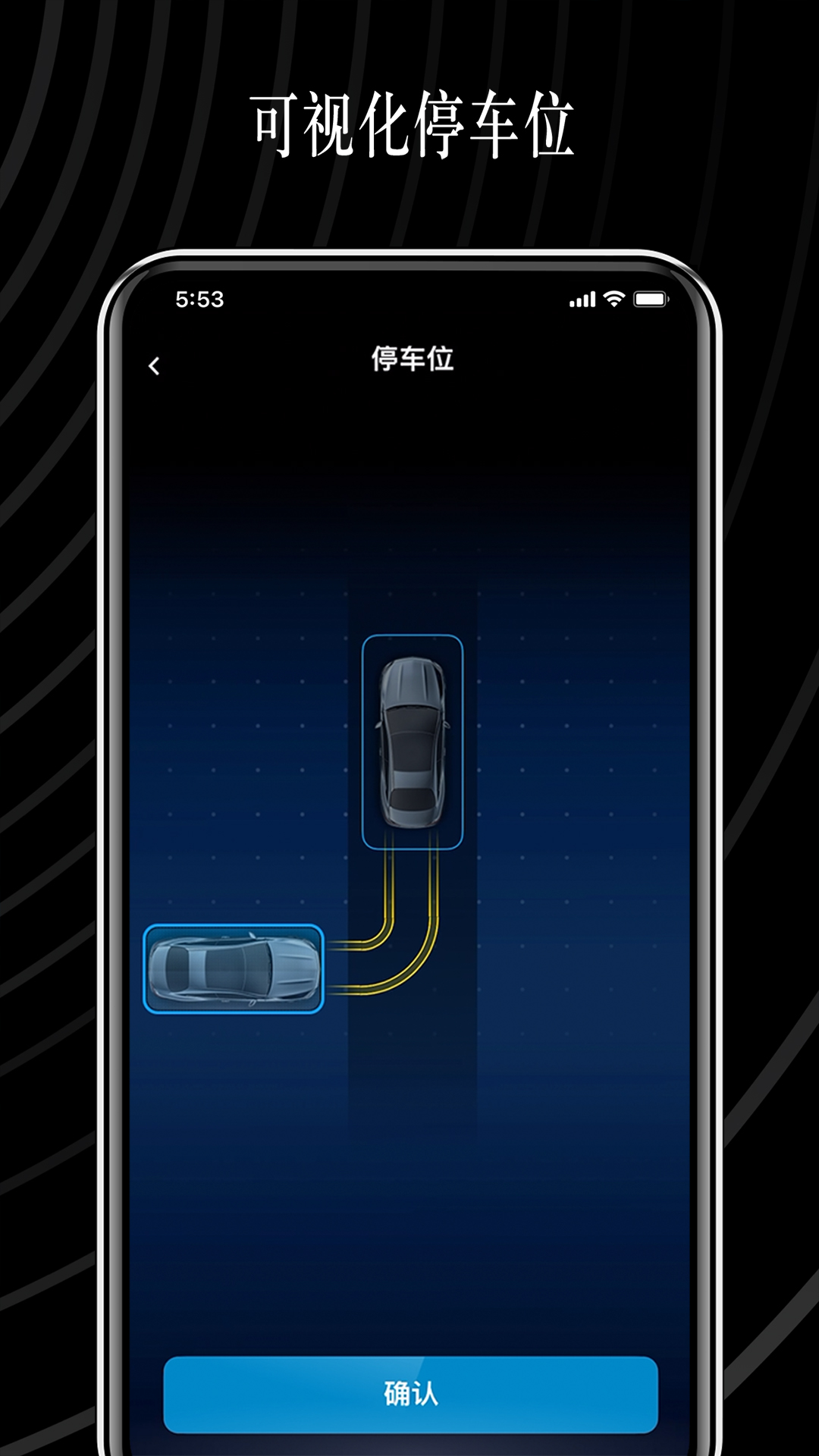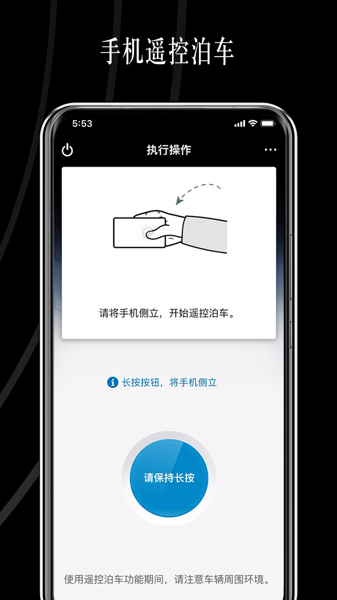 当您需要泊车时,选择一个空闲停车位,下车并站在车旁,长按手机按钮并将手机侧立,即可遥控移动车辆至停车位。