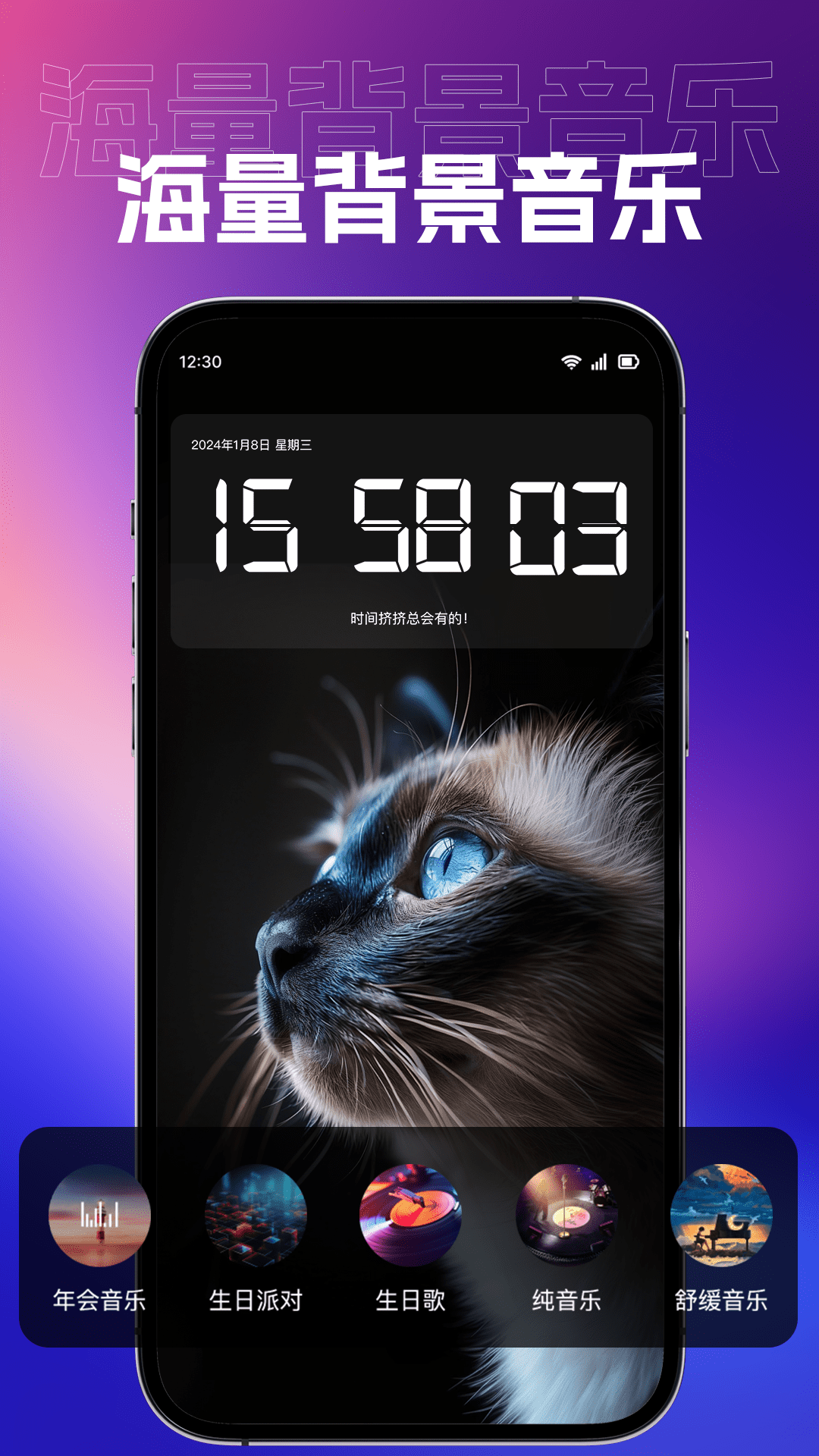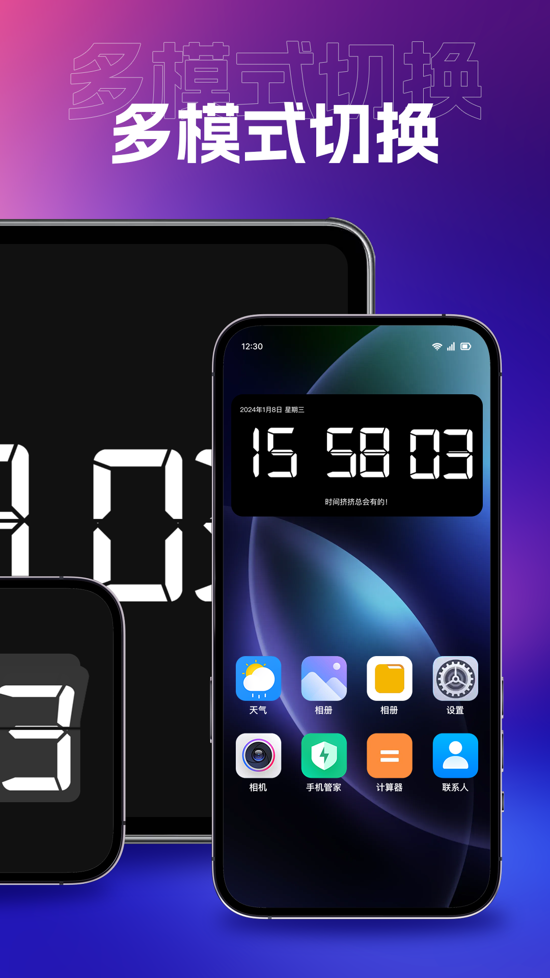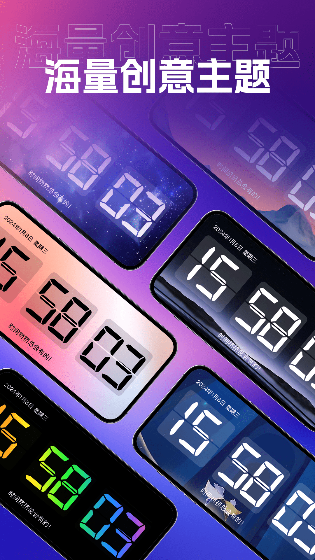 【个性化定制】支持对时钟的颜色、字体大小、背景等进行细致调整,提供多套皮肤/铃声素材,打造出您专属悬浮钟。