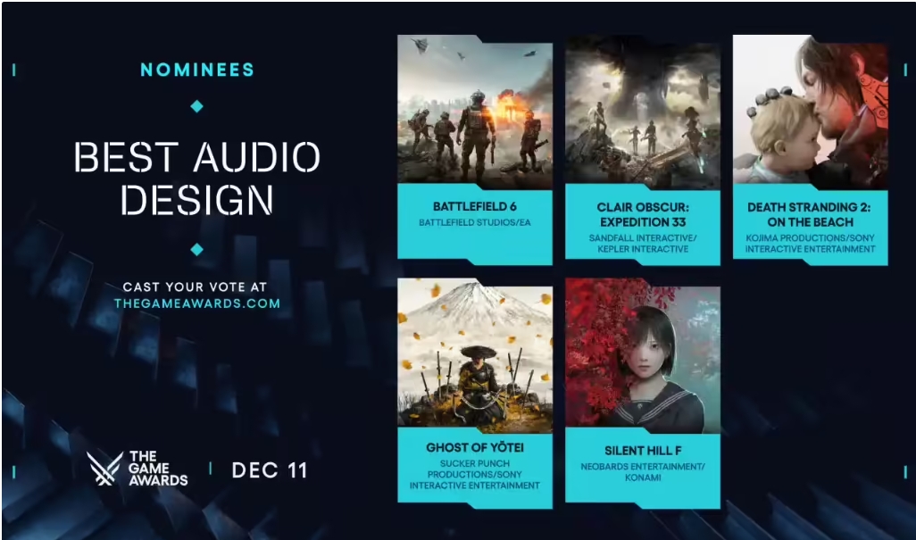 入围:《死亡搁浅 2:冥滩之上》、《羊蹄山之魂》、《黑帝斯 2》、《空洞骑士:丝之歌》。