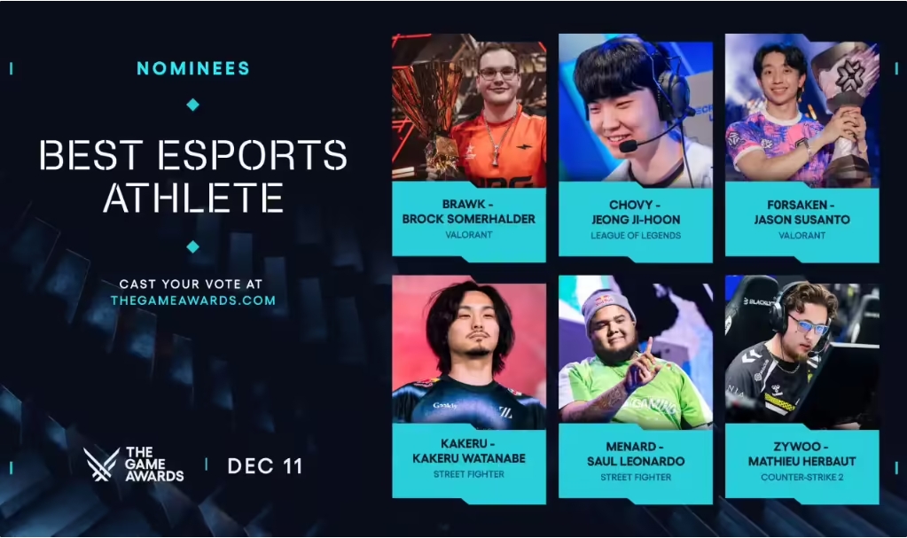 入围:brawk -《无畏契约》、f0rsakeN -《无畏契约》、Kakeru -《街头霸王》、MenaRD -《街头霸王》、ZywOo -《反恐精英 2》。