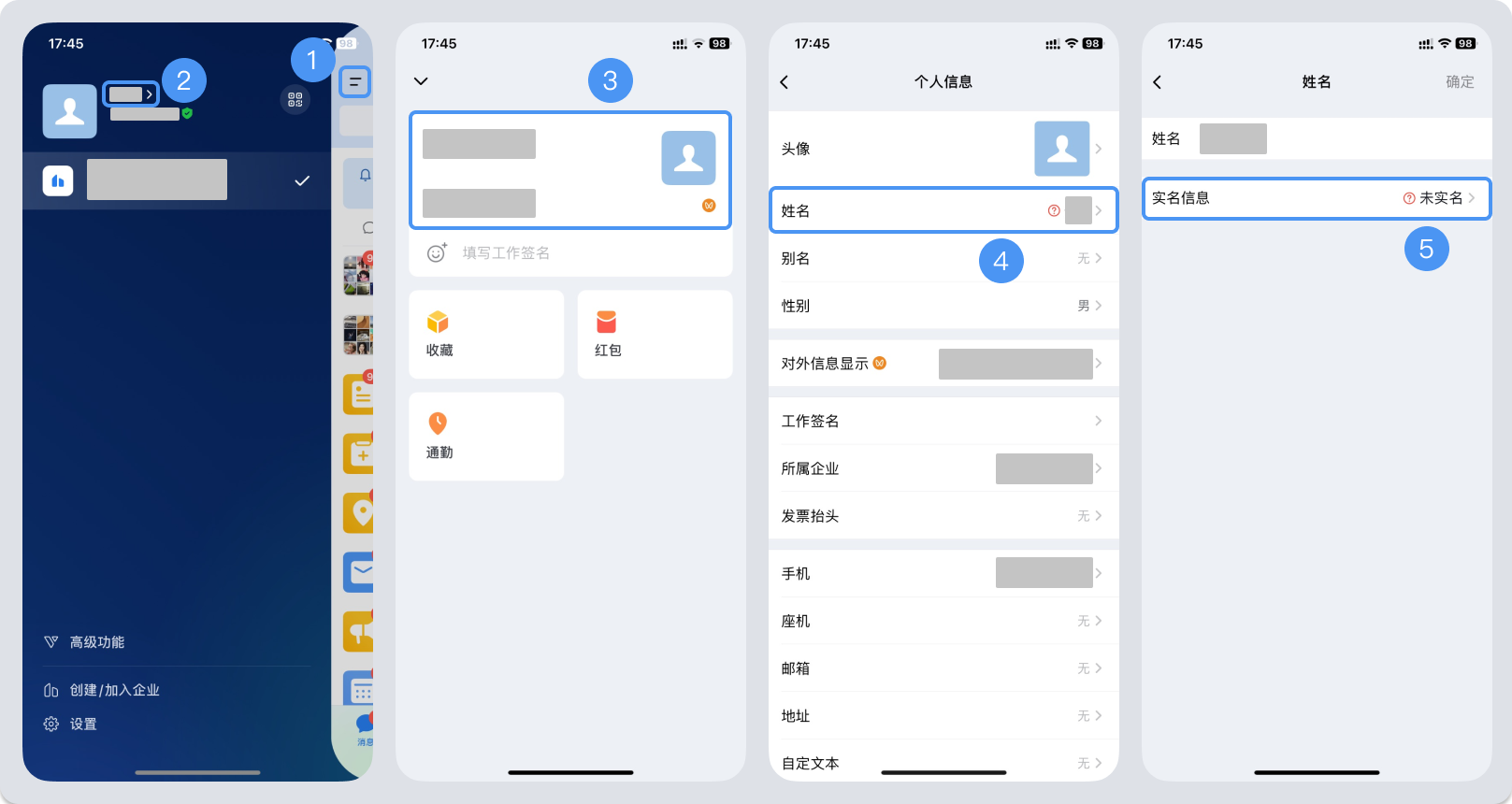 1、实名入口:【手机端->消息界面左上角“三”->头像->个人信息->姓名->实名认证】