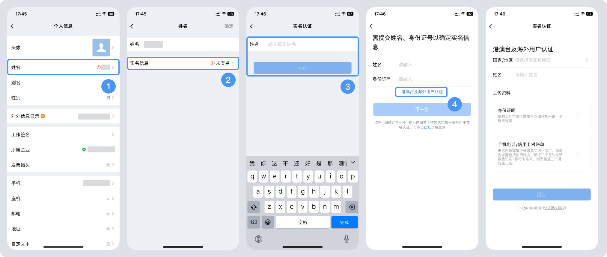 3、境外用户实名(包含港澳台):可在实名页面进入【港澳台及境外用户认证】,提供身份证、台胞证、护照、驾照、港澳通行证或境外永久居留身份证(证件均需在有效期内),另需要提供手机近3个月电话对账单/银行对账单,审核时间3个工作日。