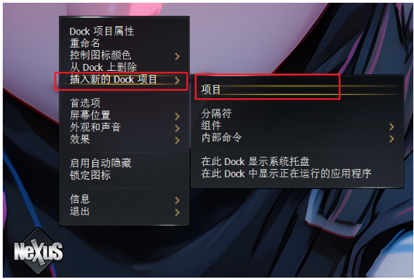 8、右键Nexus,点击“插入新的Dock项目”,选择“项目”。