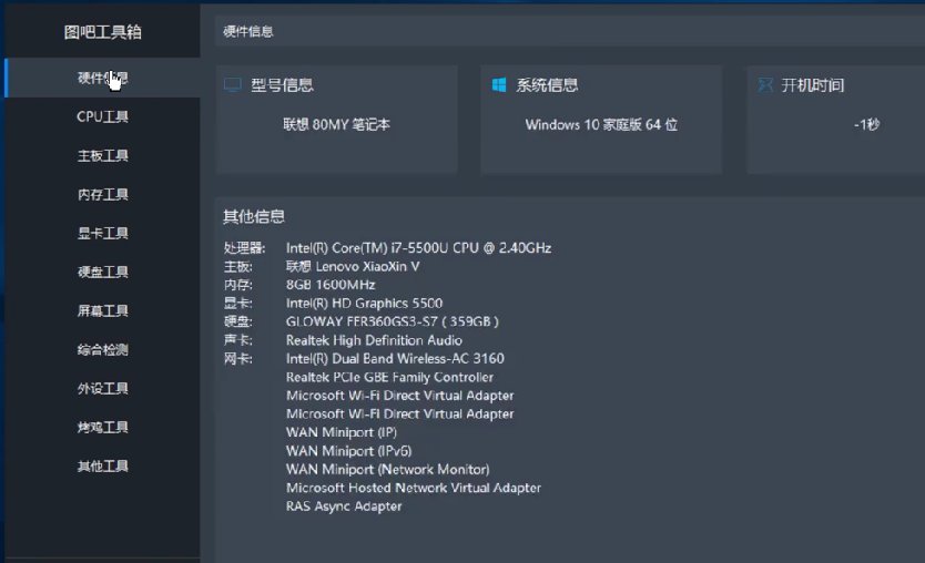2、进入了图吧工具箱之后,就可以看到左侧菜单栏有硬件信息,侧面板就会显示电脑各硬件的实时信息,其中就包含CPU温度。