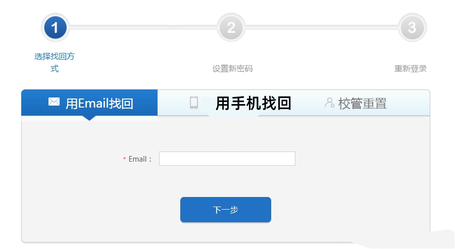 2、进去后能看到邮箱、手机和校管重置三种方式,选一个适合自己的点下一步,就能重置新密码了。
