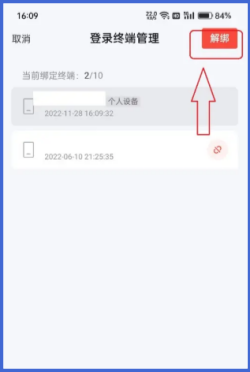4、点击右上角解绑,确认后即可将刚才选中的终端解绑。