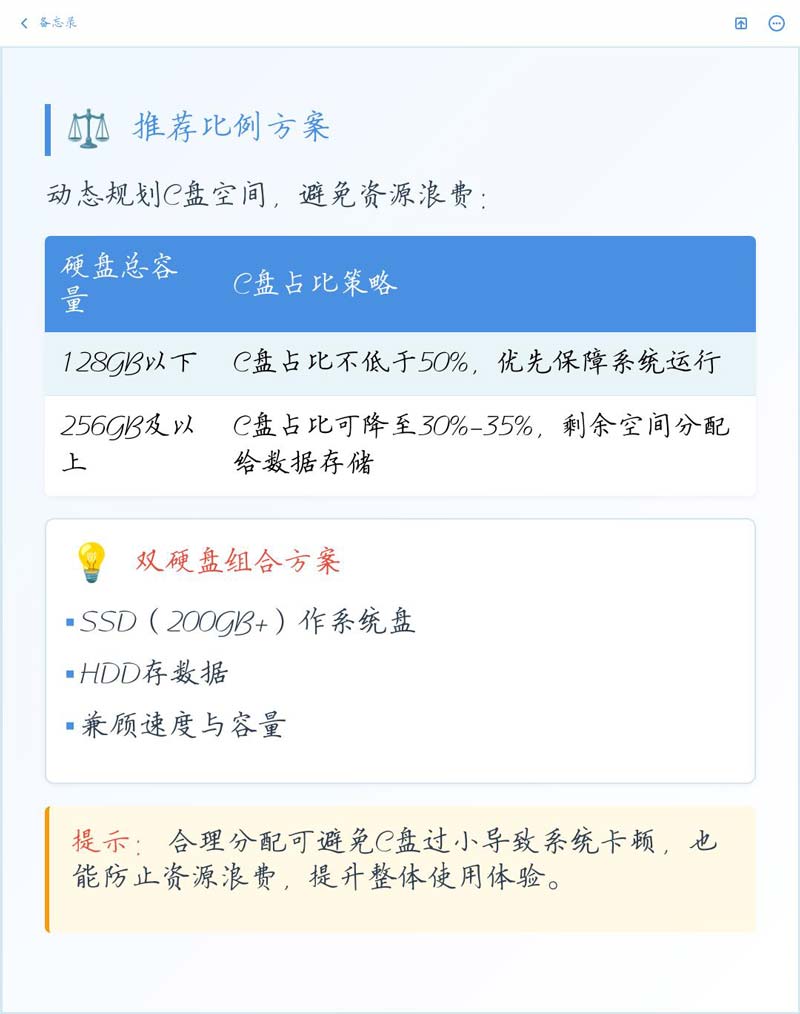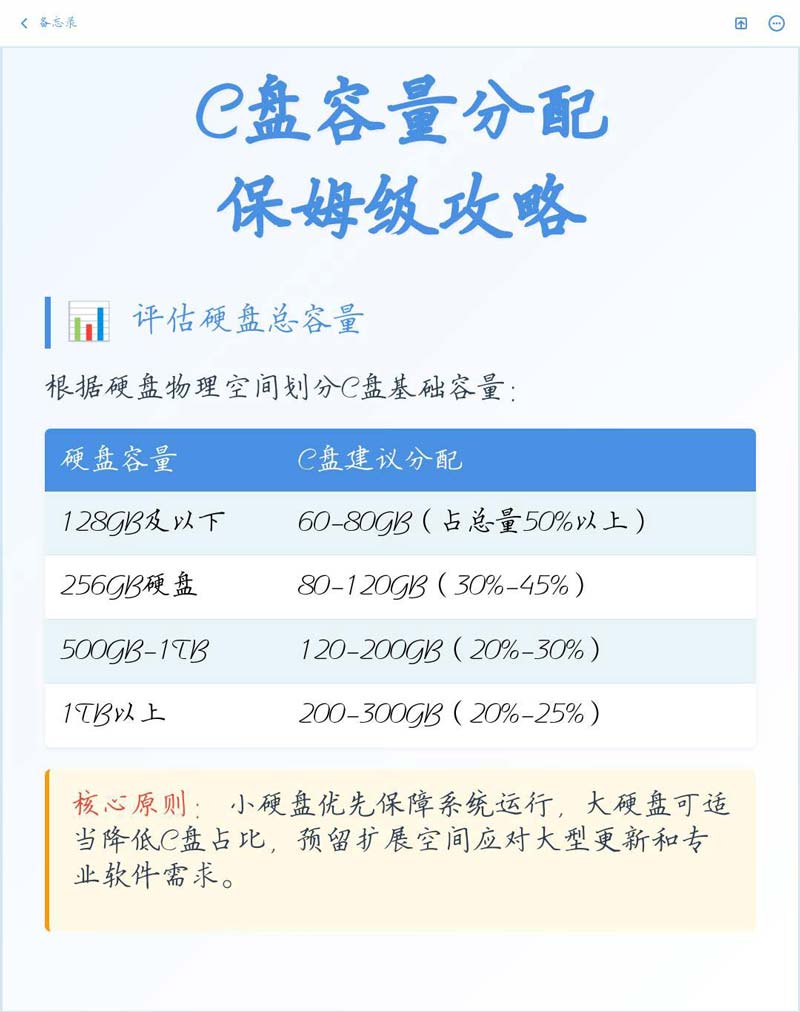 128GB小硬盘C盘至少占一半分60到80GB;256GB硬盘分80到120GB最合适,占总量的三到四成;500GB到1TB的大盘分120到200GB够用;要是超过1TB的巨硬盘,给C盘留200到300GB就行,保持两成比例即可。