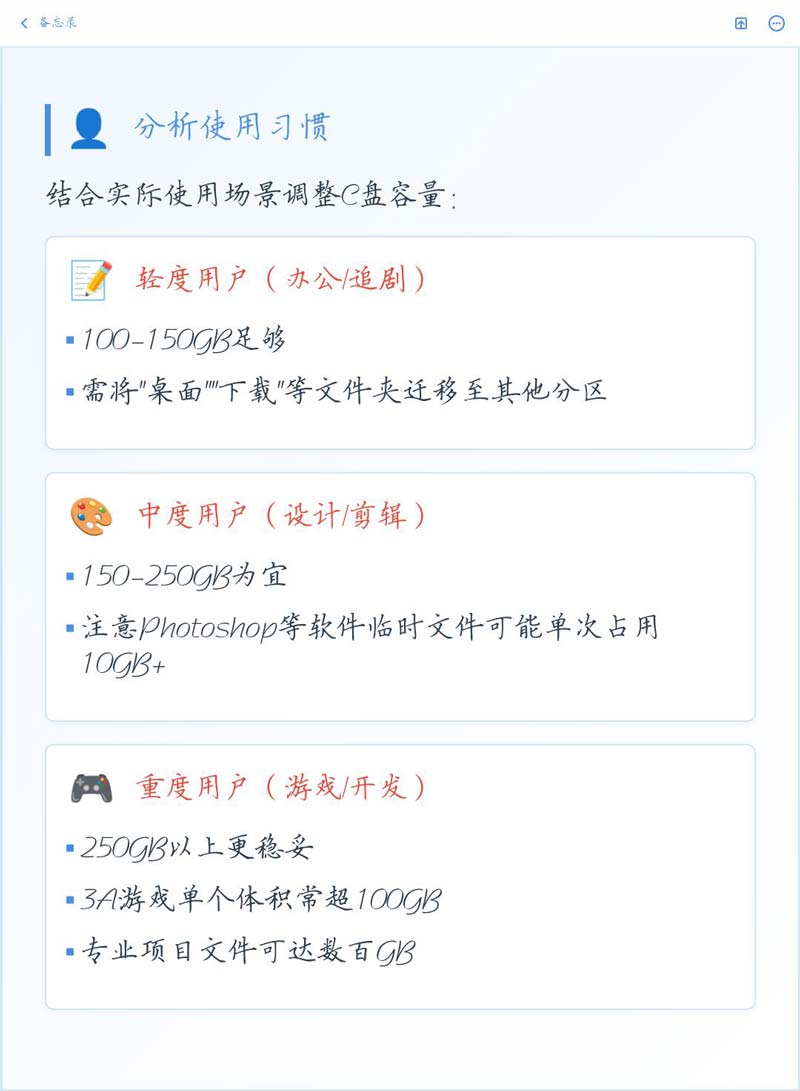 普通办公学习用户分100到150GB就行,装点办公软件和微信足够了;游戏和设计用户建议分200到300GB,大软件装C盘,游戏素材放别的盘;搞专业视频剪辑的最好给300到500GB,不然缓存爆满会卡得要命。