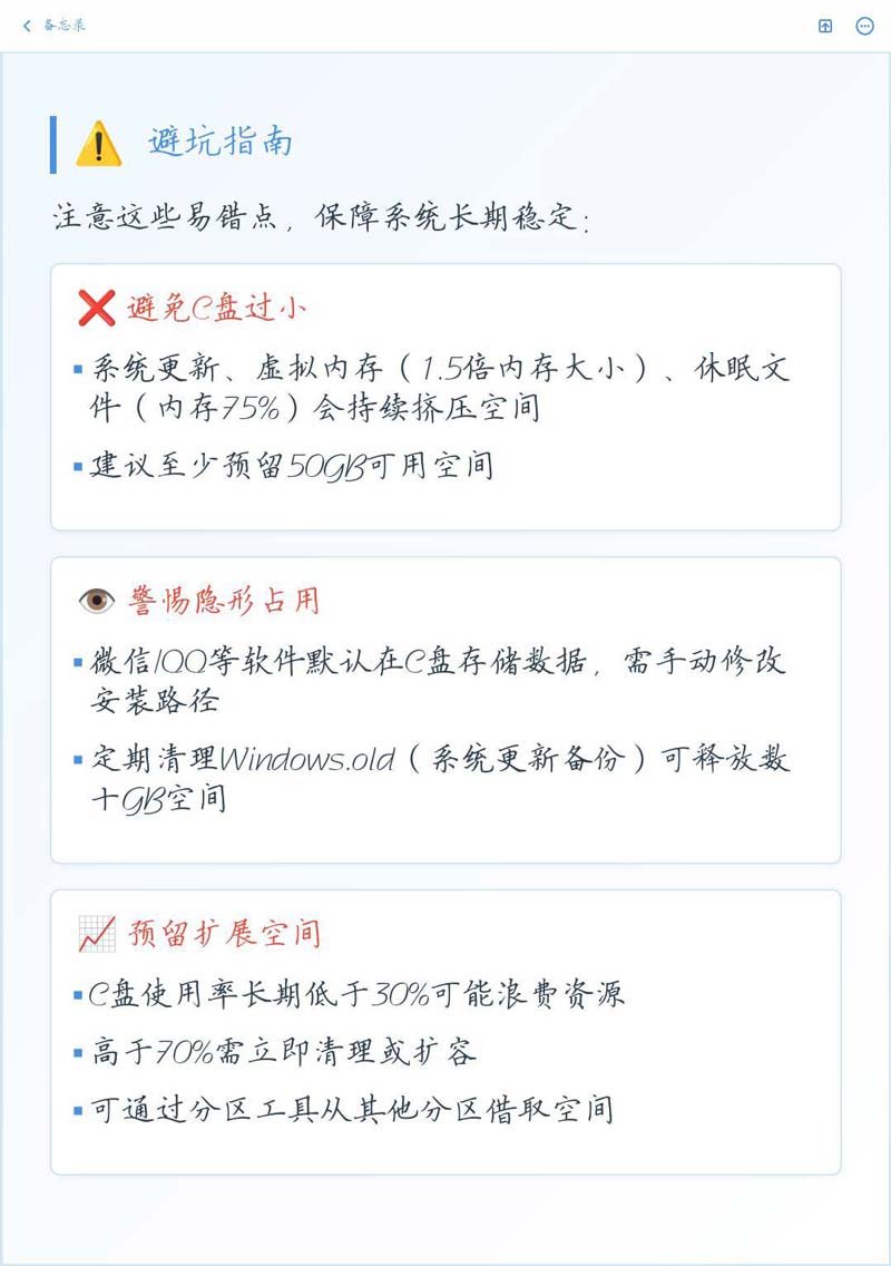 通过C盘留合适空间来提升体验,核心在于“精打细算与日常维护”。安装软件时多看一眼,坚决改掉默认路径,把大型应用请出C盘。C盘设置低空间警告,一旦变红就及时转移大文件,从源头掐断C盘拥堵的可能。