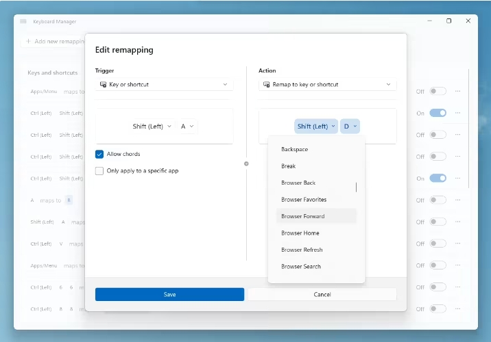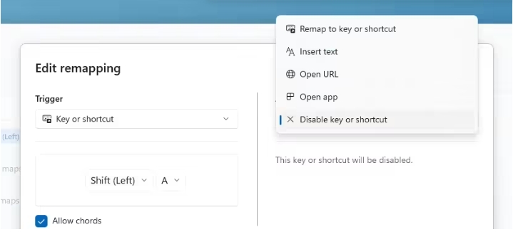 Keyboard Manager编辑器现支持通过下拉菜单手动微调已录制的键映射,甚至能绑定实体键盘上不存在的按键。新增的“禁用”动作可快速封印特定按键或快捷键,同时修复了多行文本替换在各类聊天软件和文本编辑器中的可靠性问题。