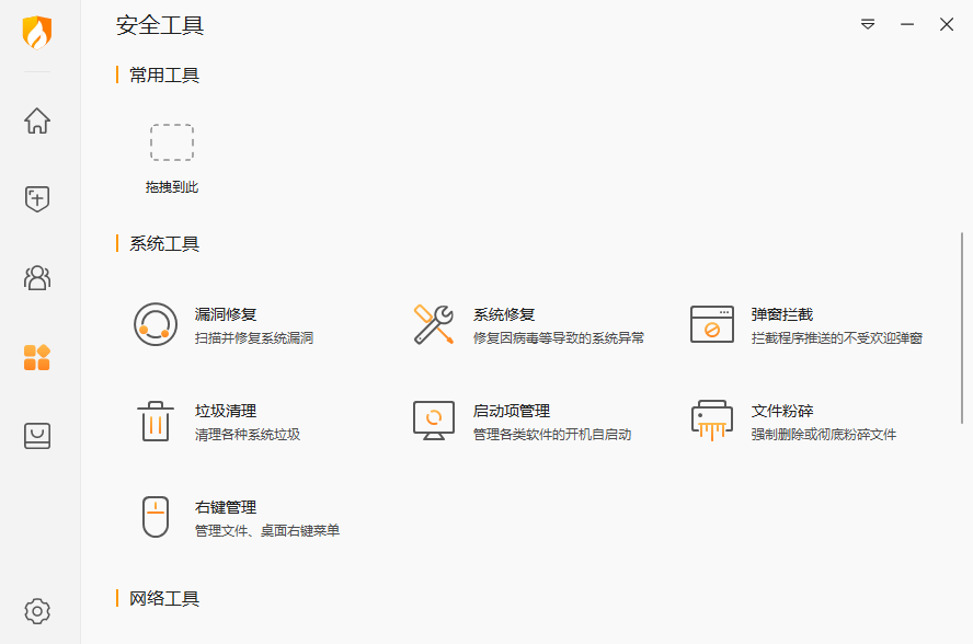 答:1、打开我们已经安装好的火绒安全软件。然后点击其界面左侧打开“扩展工具”,如下图所示:
