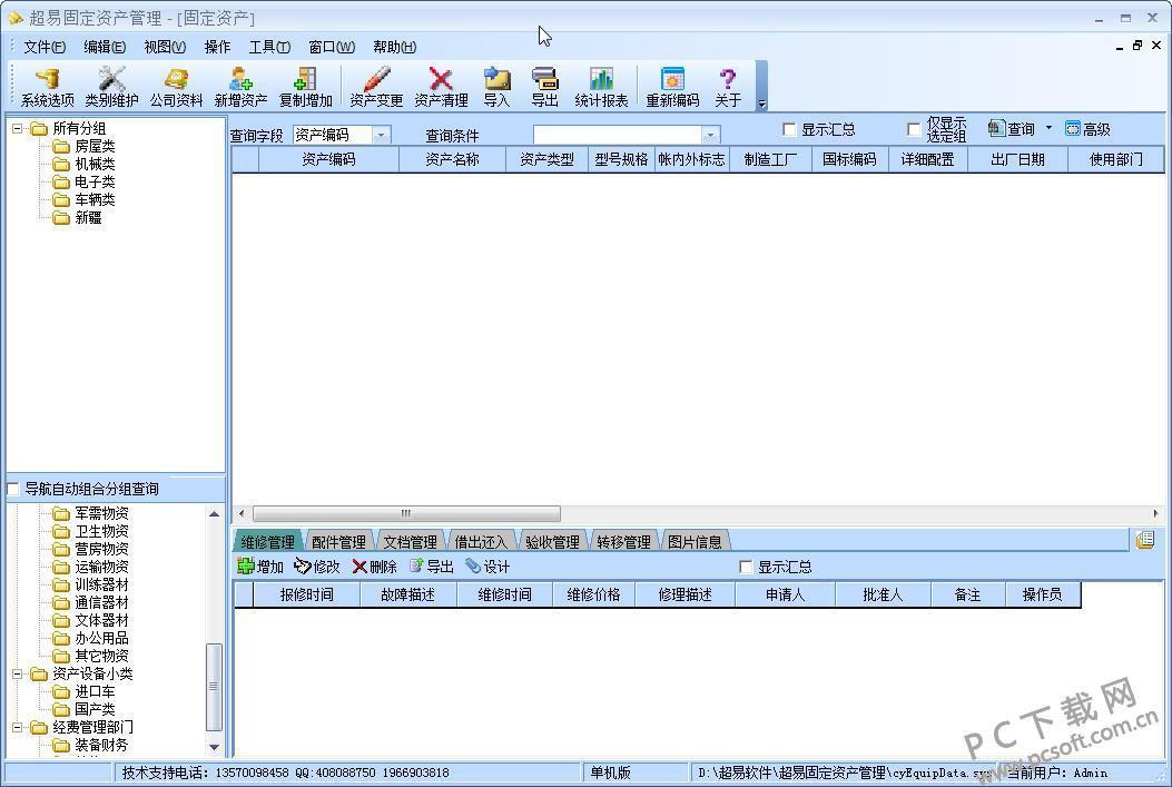 超易固定资产管理软件是一款固定资产管理软件,有资产调拨,文档管理,借出与归还,资产转移管理,数据查询,报表统计,打印等等功能,避免资产流失具有良好的辅助作用,可以帮助管理者 条理清晰,方便简单的使用,大大的提高了工作效率!