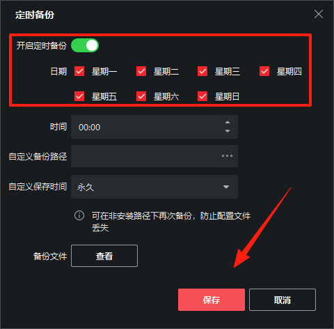 2、开启定时备份后点击保存。