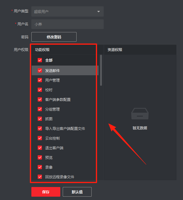 2、接着在用户权限处勾选需要的功能权限,点击保存。