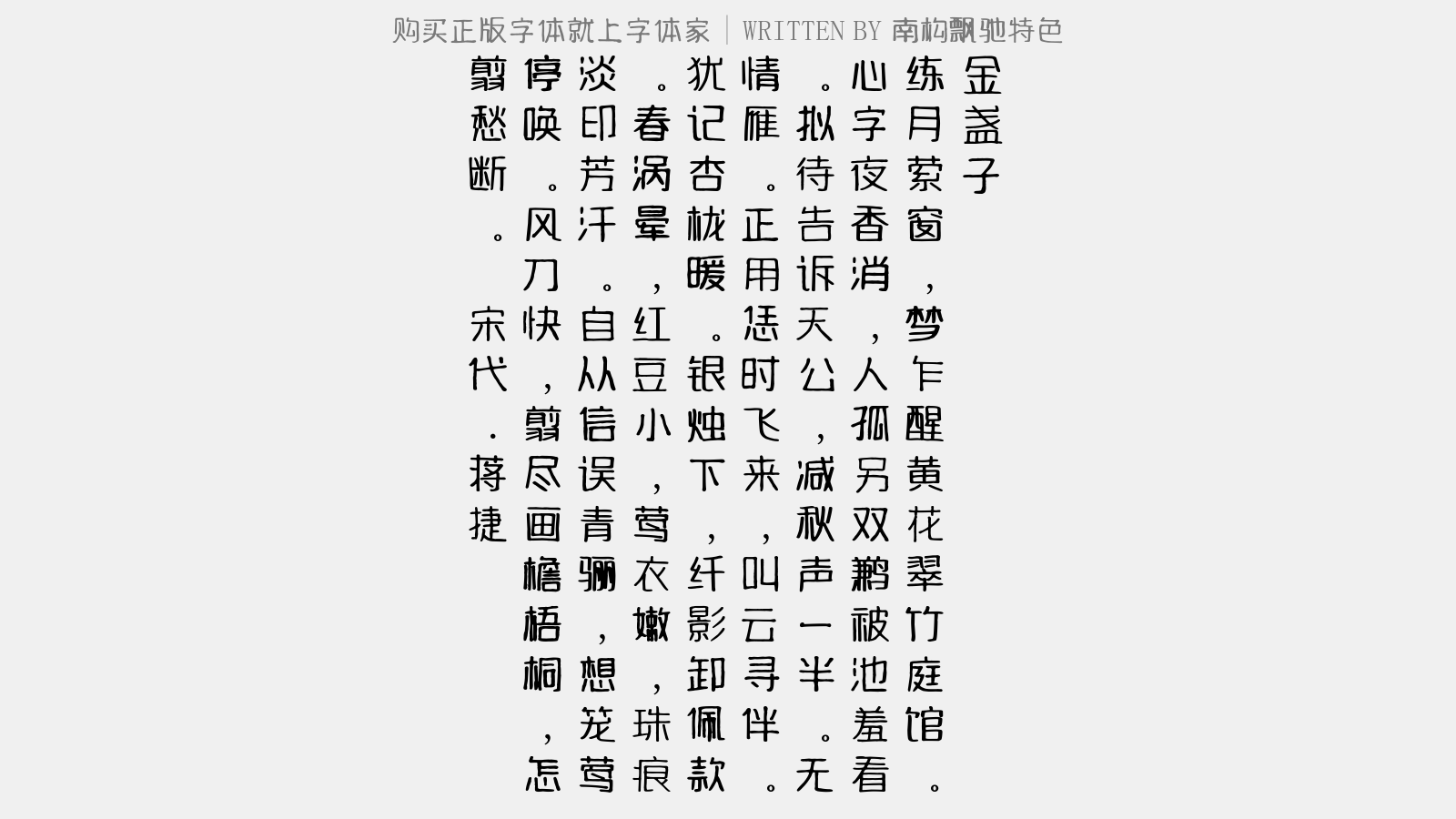 南构飘驰特色是一款非常不错的个性字体,个性醒目,字形端正柔和,整体风格统一,具有强烈的视觉冲击力,适应于报纸和杂志和书籍中常用字体, 海报、个性促进品牌标志设计、字体设计、等环境使用。
