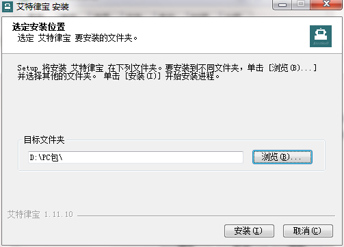3.双击打开,进入艾特律宝软件界面,选择目的地位置,软件将被安装到以下列出的文件夹中,要选择不同位置,建入新的路径,点击安装
