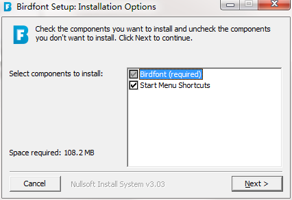 3.双击打开,进入birdfont软件界面,选择安装组件,勾选你想要安装的组件,并解除勾选你不想要安装的组件,单击下一步