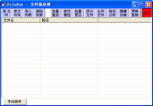 批量文件(夹)处理工具,可快速选定所需的各种文件,实现批量查找与替换、多功能批量更名、批量文件格式分析、多文件合并与拆分、批量文件属性修改、文件伪装/隐藏/寄生、多功能文件复制备份等功能。