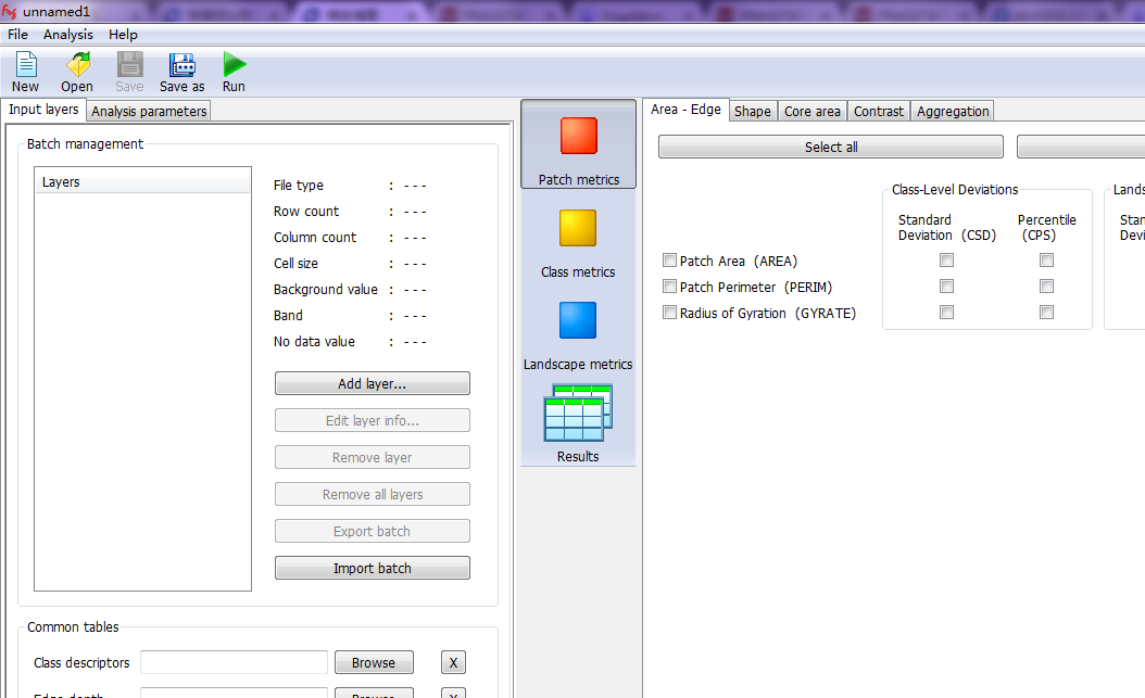 Fragstats新建工程之后会出现Add layer从而选择输入的格式。比较常用的就是ASCII、ARCGIS的grid、ESRI grid 和 tif图。一般来说,并不是一般的图都可以跑,输入的图必须带有以下信息(行列信息,波段信息,背景值信息,像元大小信息)。我一般是导出tif图。因为无论是ASC码,还是grid图都可在arcgis中转出tif,tif图容错性强,可以节省很多时间(如果要用arcgis/arcview的grid图,需要设置环境变量网上有很多教程)