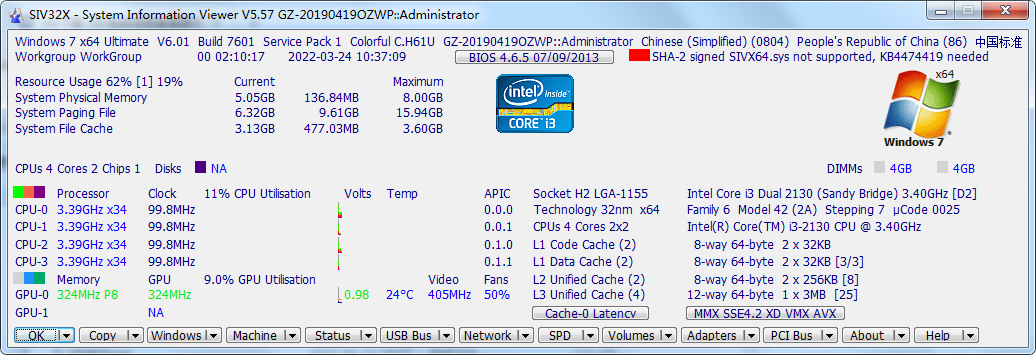 SIV最新版是一款优秀的系统信息查看软件。SIV官方版可以用于查看CPU处理器核心数及核心的倍频外频,时钟频率及CPU荷载,查看内存容量及频率,CPU L1/L2/L3缓存大小。SIV最新版默认的SMBus从0x06的扫描范围,0x60被选定为一些系统已经在上面0x5F的SMBus从地址的访问的问题。如果您决定延长扫描范围那么你的SMBus可能锁定,您将需要重新启动,以得到它的工作了。