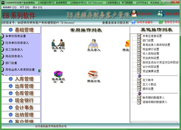 e8进销存财务客户管理软件最新版是将进销存财务客户五位一体化的软件,特别为中小企业设计,它的功能范围包括基础管理、入库管理、出库管理、退换货管理、仓库管理、现金银行管理、库存管理、会计事务、营销设置、营销分析、出纳管理及各类汇总统计报表,并配备有功能完整、全面的经营报告系统及营销分析系统(收支明细表、进货明细表、销货明细表、库存一览表、货品进销一览表、经营状况表、明细帐、总帐、会计报表、各类营销分析表、各类营销排行表、多功能核算库存成本等等)。