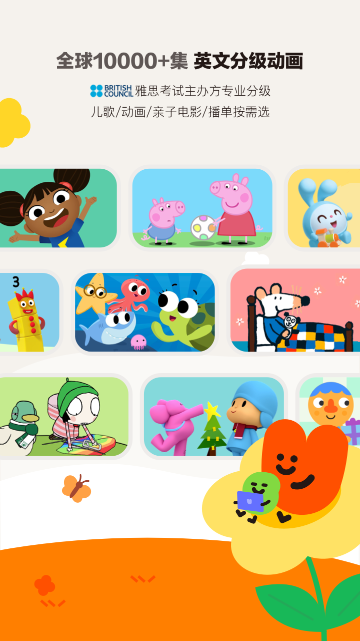 播放风靡全球的Super Simple、猜猜我有多爱你、奥趣多、奇妙球家族等精品启蒙动画。